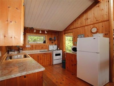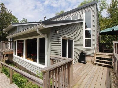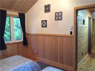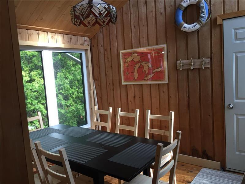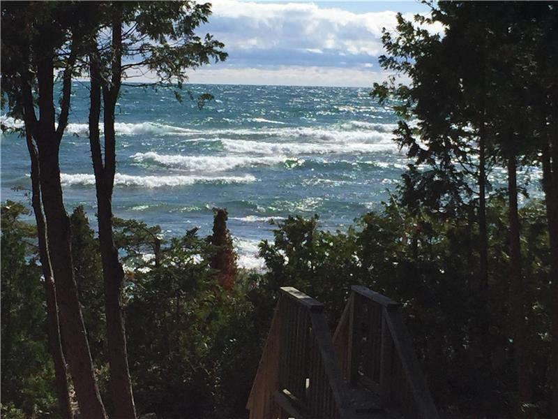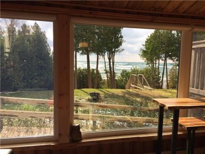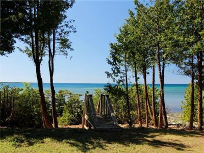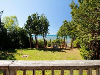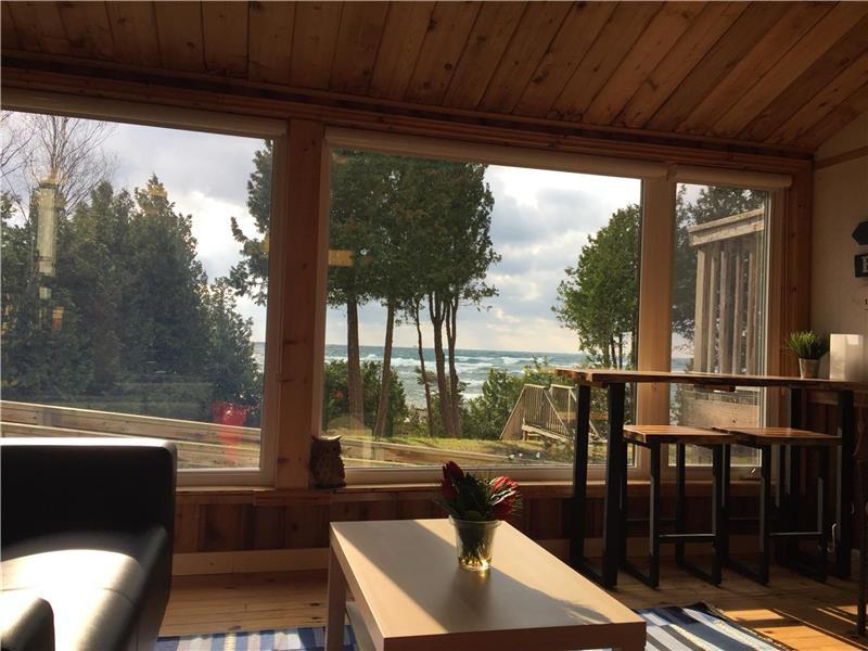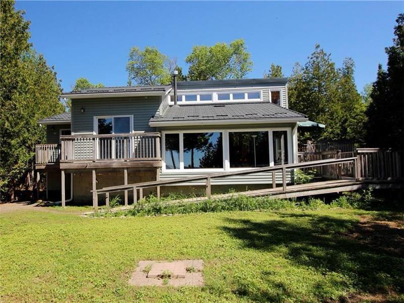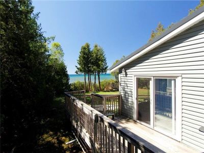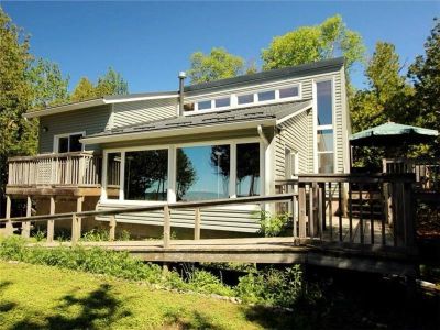Escape to this beautiful lakefront cottage just 15 minutes from Tobermory. Enjoy breathtaking Lake Huron views from nearly every room, a private beach with shallow water for swimming and canoeing, and peaceful forest trails surrounded by cedar trees. The open-concept living area with skylights and cathedral ceilings creates a bright, relaxing space. Two bedrooms feature private balconies—perfect for morning coffee or stargazing at night.