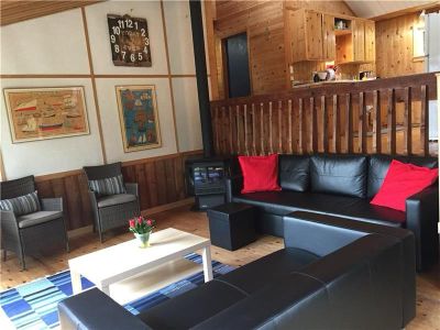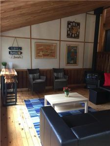 The main living area is filled with natural light and stunning lake views, creating a warm and inviting space to gather after a day outdoors.