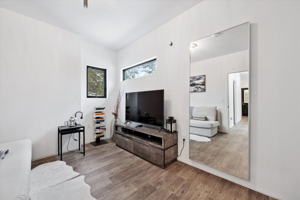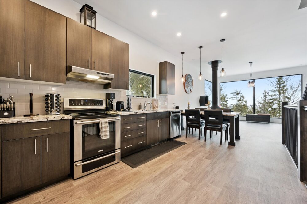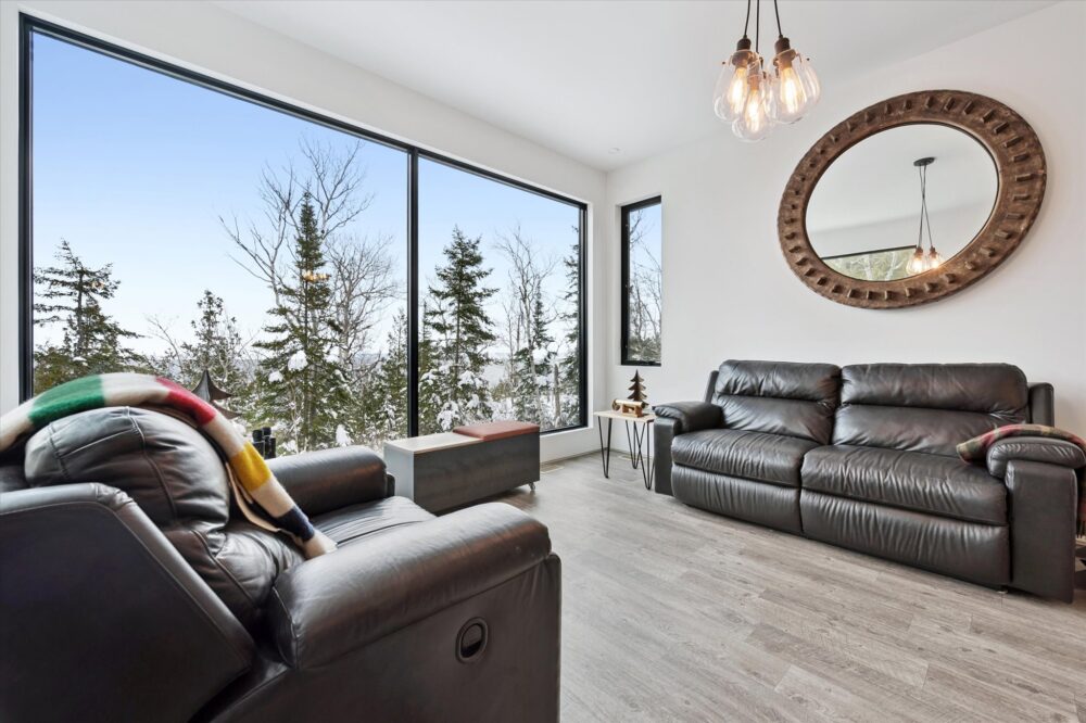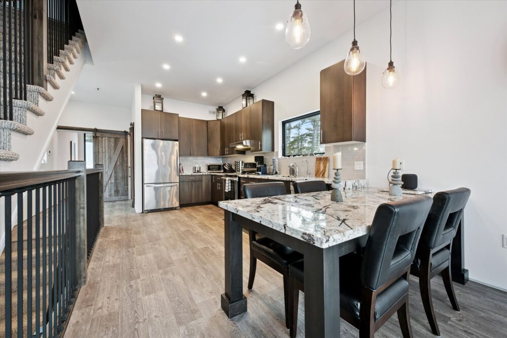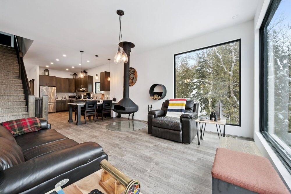 The main level is open-concept and filled with natural light thanks to expansive, floor-to-ceiling windows. The living area offers plush leather seating and a cozy fireplace that makes the space feel warm and inviting year-round. Whether you’re coming back from a day on the trails or settling in for a slow morning coffee, this is the heart of the home.