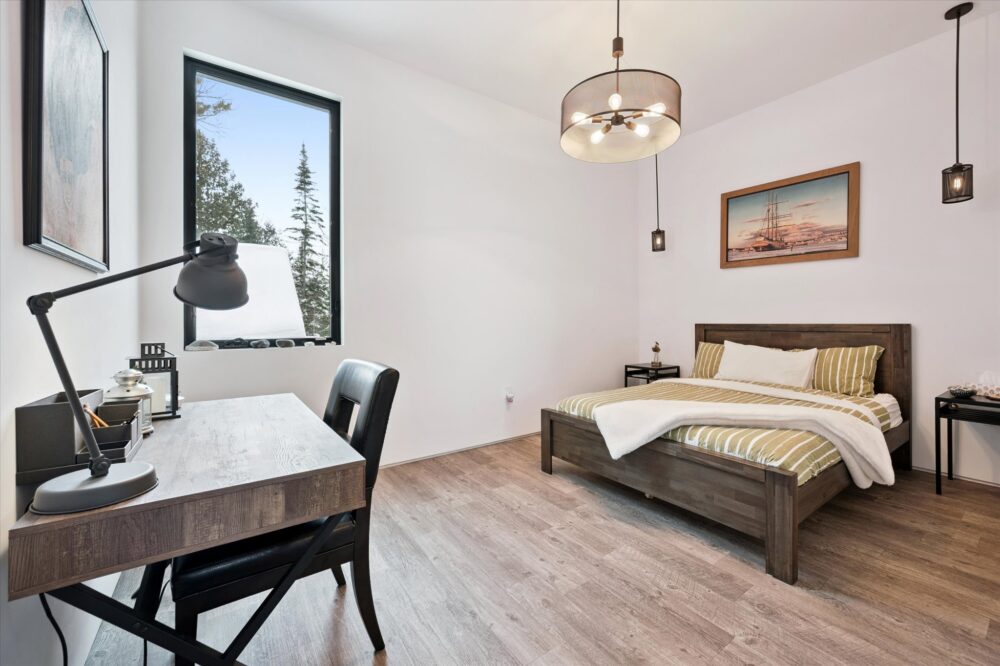Bedrooms are calm and minimalist with soft textures, modern lighting, and peaceful forest views—perfect for deep, quiet sleeps after outdoor adventure. The bathroom continues the spa-like feel with a double vanity, contemporary finishes, and a glass walk-in shower.
