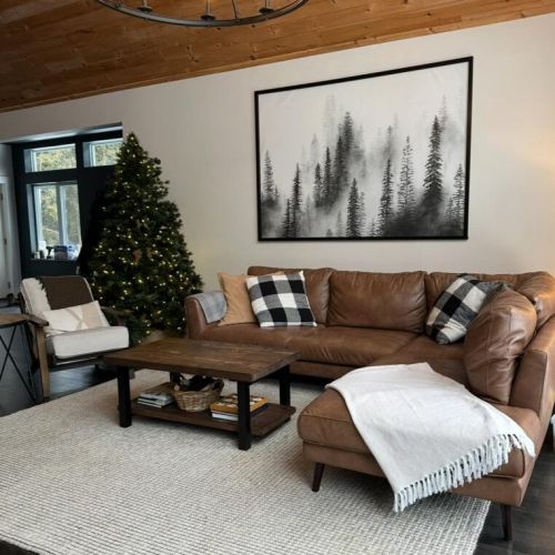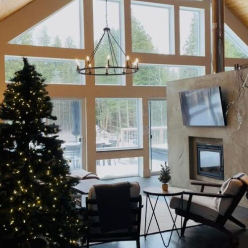 This spacious home features 1.5 storeys, three bedrooms, three bathrooms, and a stunning loft that overlooks the property. In winter, the cathedral ceiling and towering windows frame the serene landscape of frosted evergreens and soft snowfall—creating a sense of grandeur and tranquility.