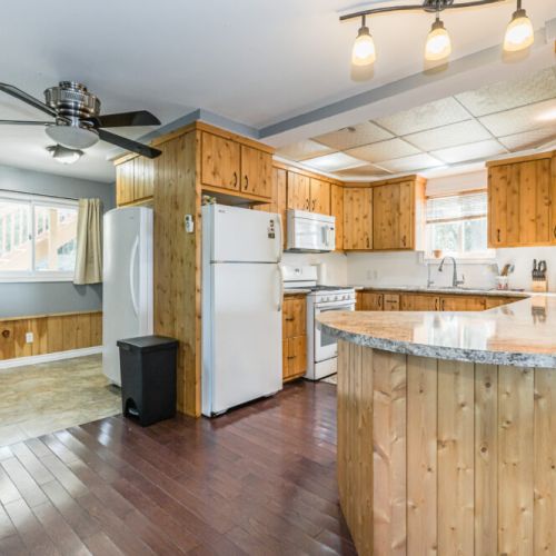 The fully equipped kitchen offers modern appliances, wooden cabinetry, and plenty of counter space—ideal for preparing comfort food, hot cocoa, or festive treats during your stay.