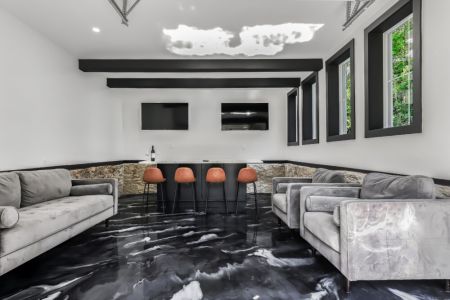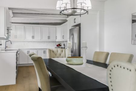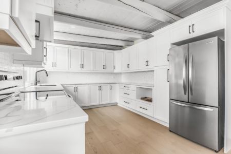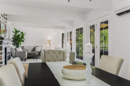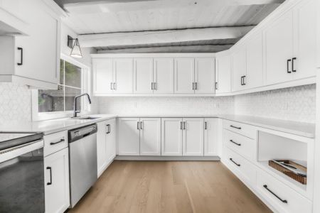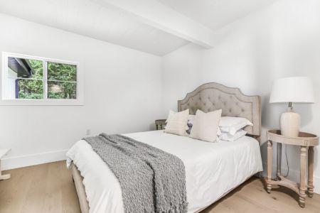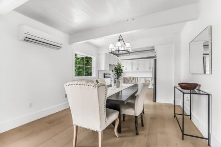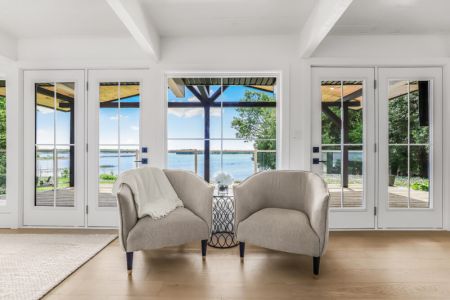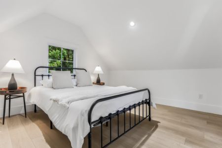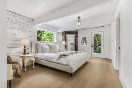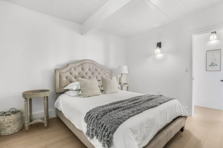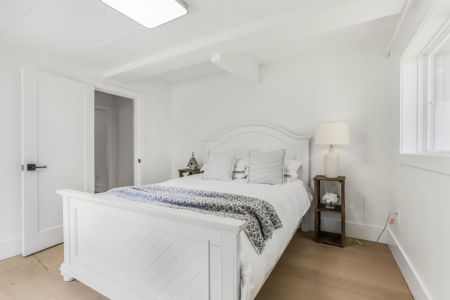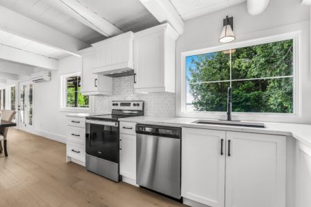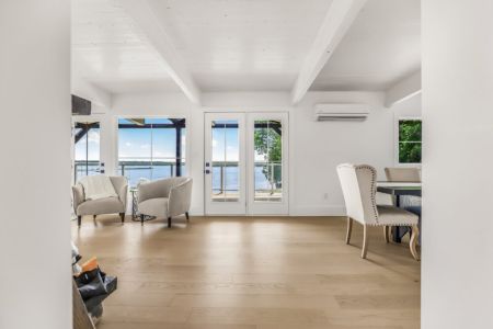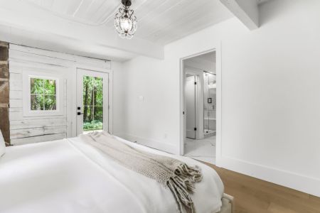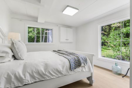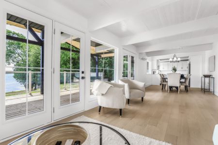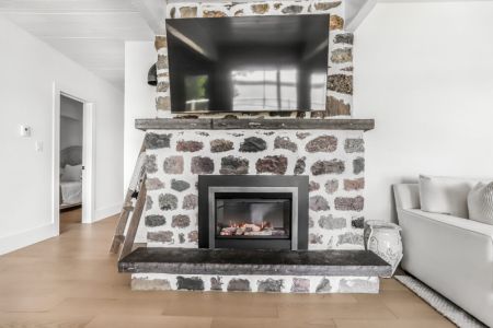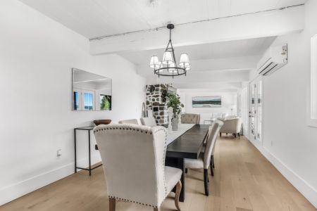 The kitchen flows right into the dining and living areas, so nobody’s stuck cooking alone. It’s well laid out and fully equipped for family meals, grilling sides, or lazy breakfasts before heading out. The whole space has a fresh, modern cottage feel—wide-plank floors, soft neutral tones, and simple finishes that keep things calm and uncluttered.