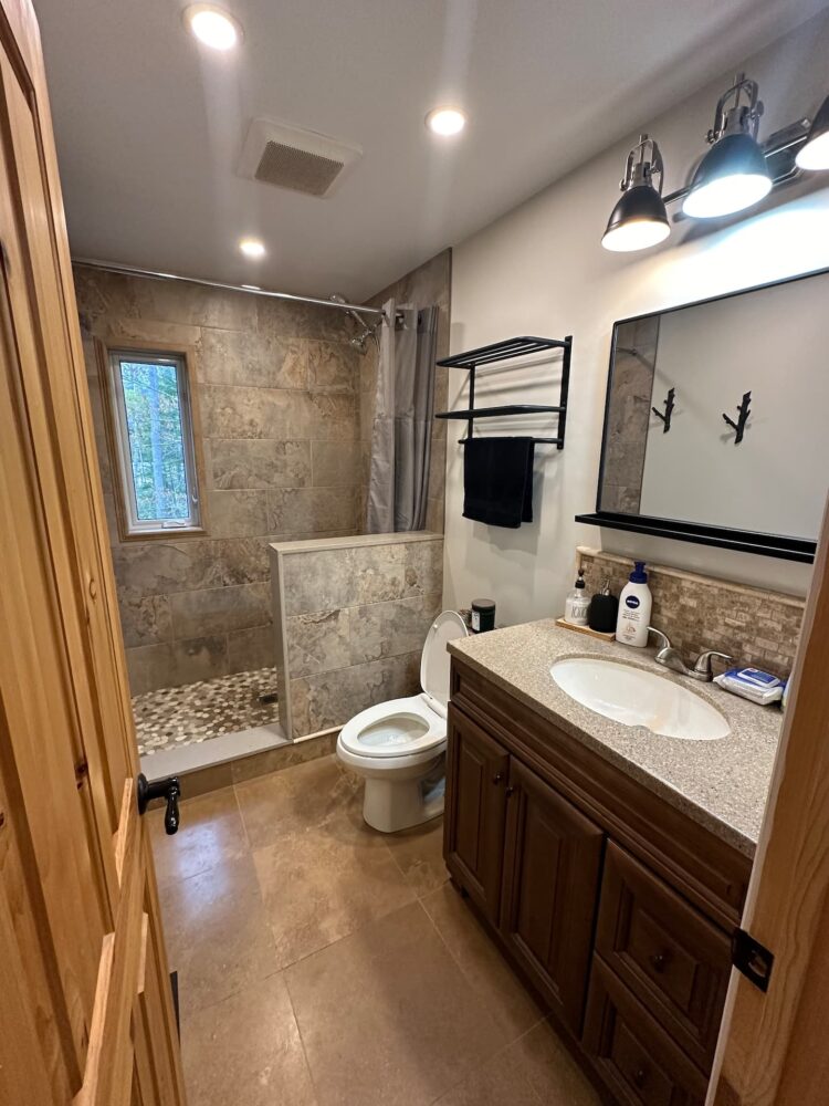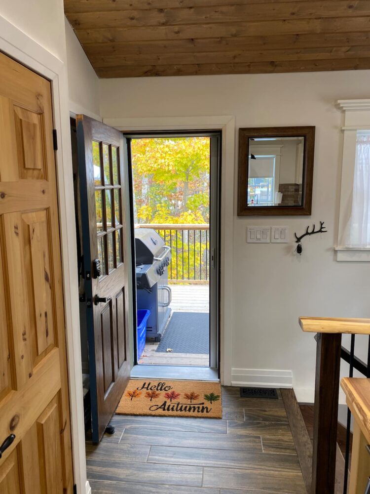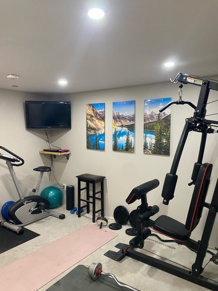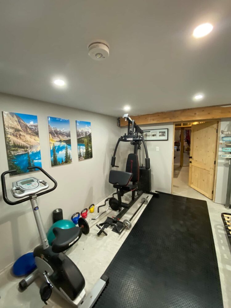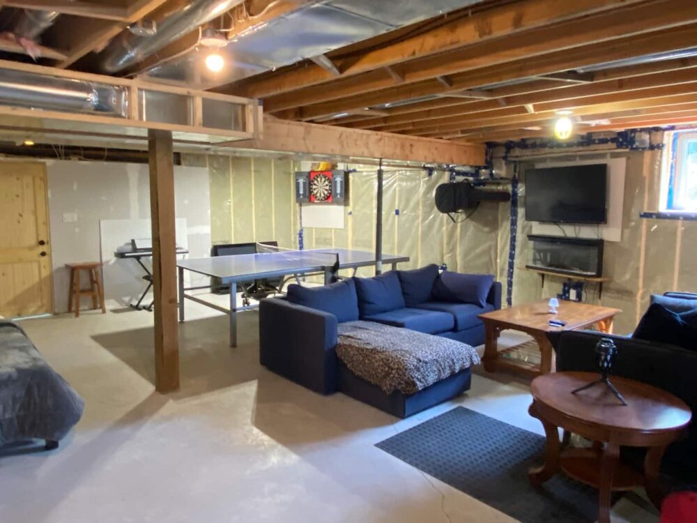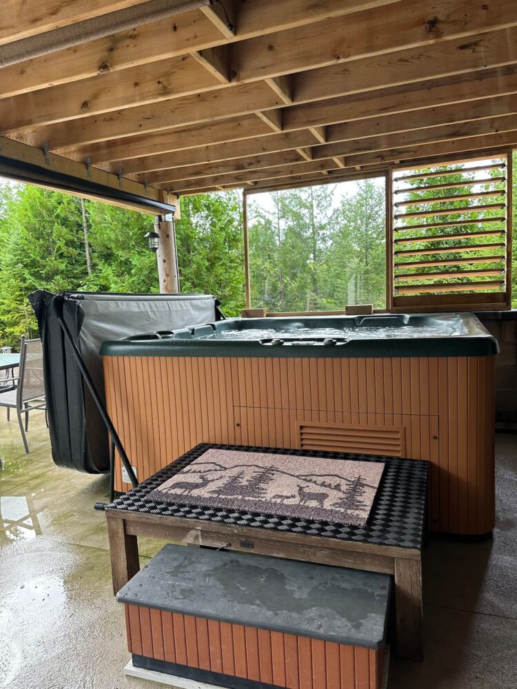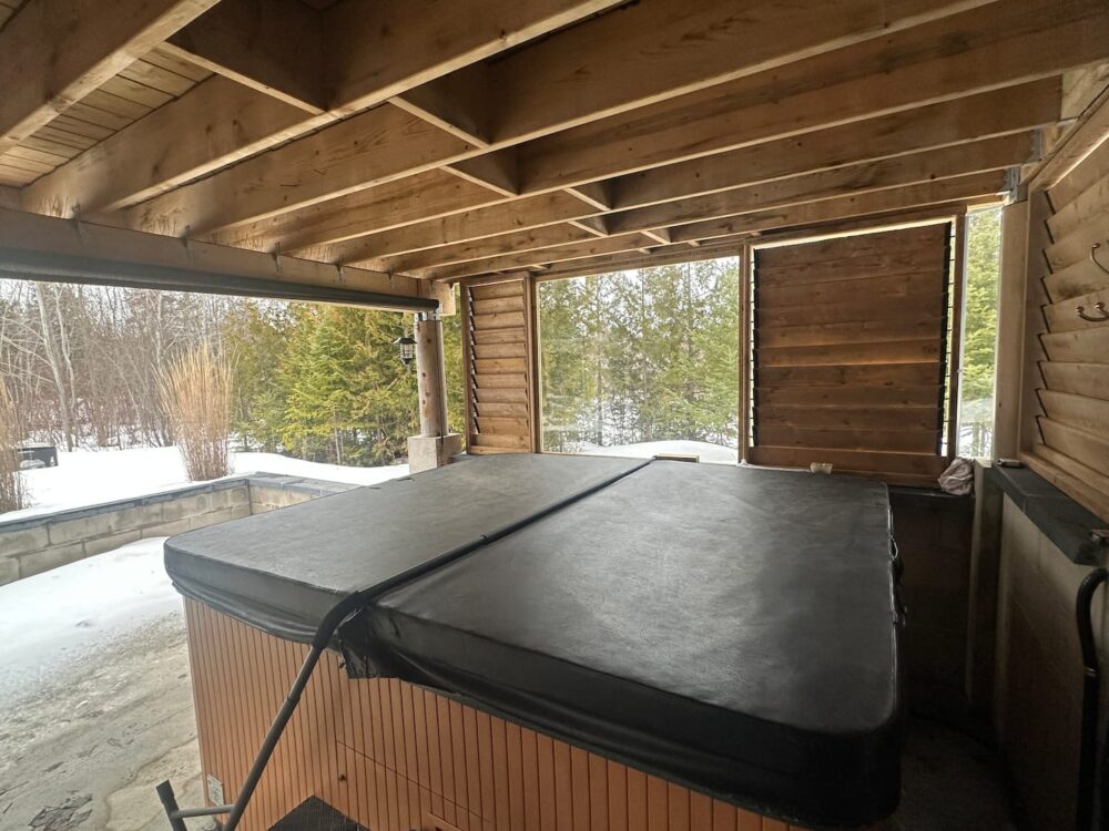 The lower level features a dedicated recreation area with a home gym, ping-pong table, dartboard, smart TV, electric piano, and acoustic guitar—ideal for both relaxation and play. Step outside from the basement walkout to the private hot tub, surrounded by nature and quiet views.