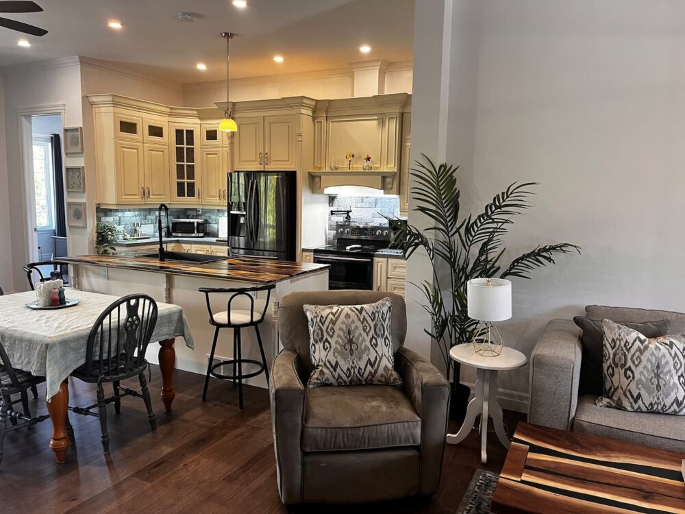 Inside, The Brick House offers four bright and spacious bedrooms with three queen beds and one king bed, comfortably accommodating families and groups. There are three full bathrooms, including a stand-alone soaker tub, as well as walk-in closets for added comfort and storage.