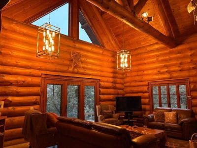 The main cabin, meticulously crafted with soaring cathedral ceilings and monumental log beams, radiates winter warmth and grandeur. The showpiece of the great room is the dramatic floor-to-ceiling stone fireplace, where glowing flames and crackling logs invite cozy evenings as snow drifts outside.