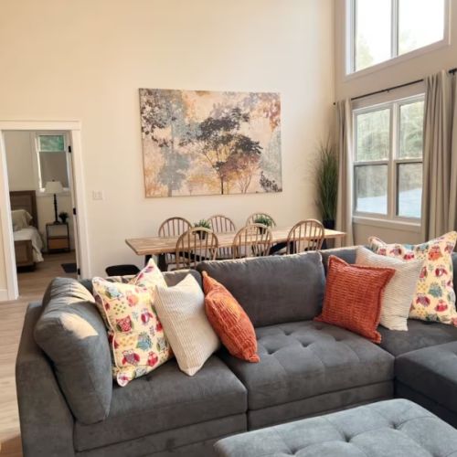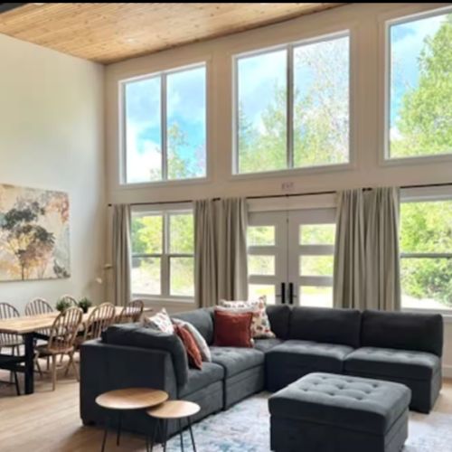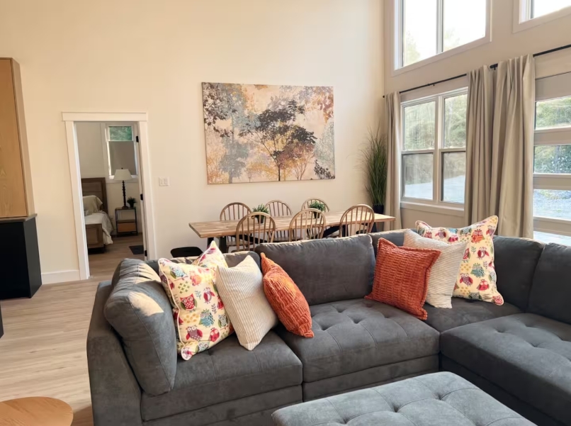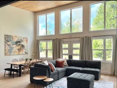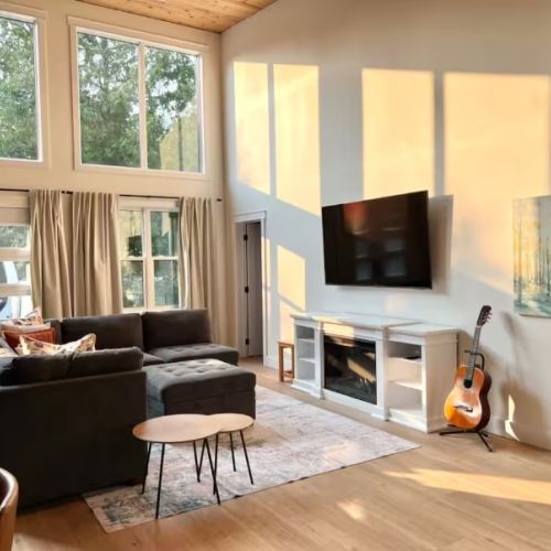 Step into a bright, open-concept winter haven with soaring ceilings, a cozy L-shaped sofa, and an inviting electric fireplace. Floor-to-ceiling windows frame serene, snow-kissed forest views, filling the cottage with soft natural light and peaceful winter calm.