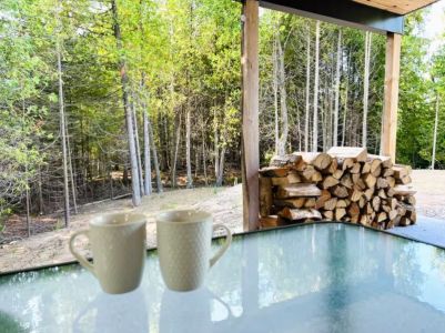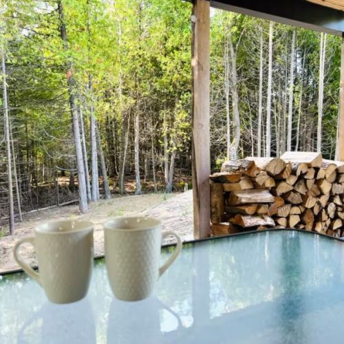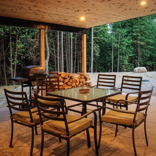 An outdoor dining area perfect for bundled-up morning coffee in the crisp forest air
