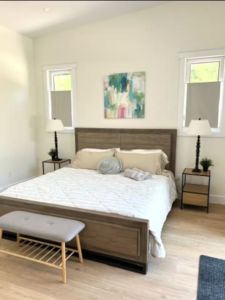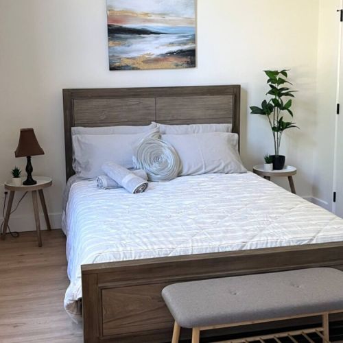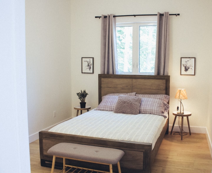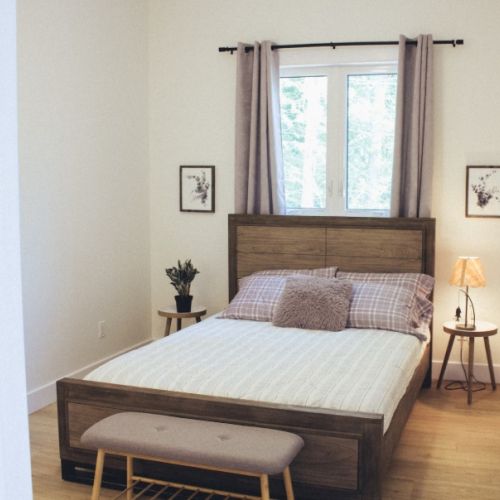 Sliding doors open to a peaceful winter landscape, with a private ensuite and spa-like calm.