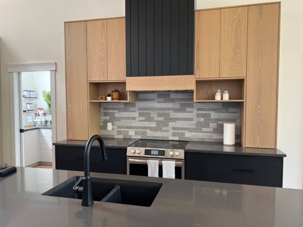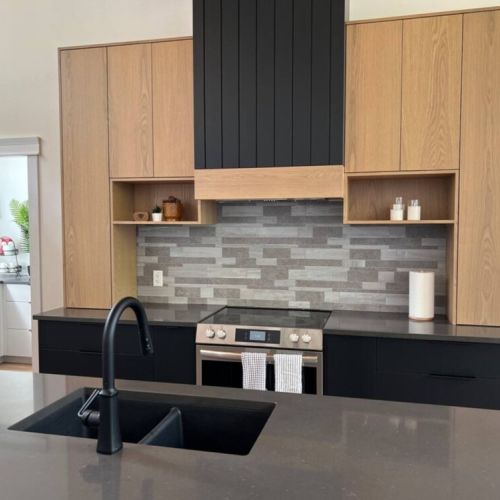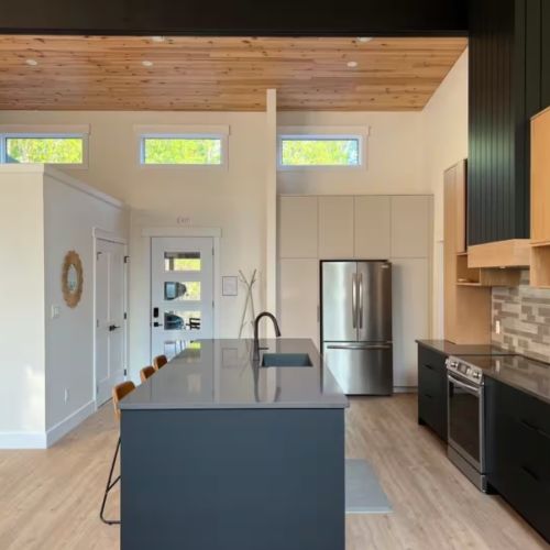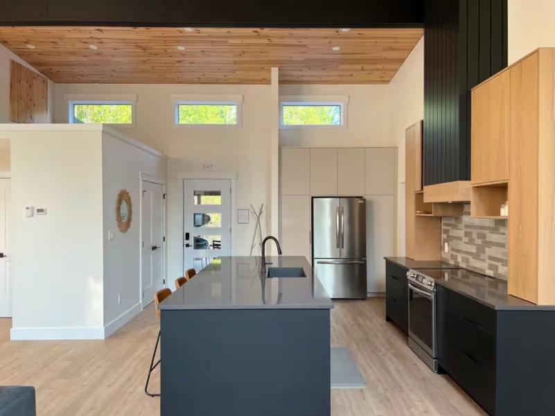 The fully equipped kitchen is designed for togetherness, featuring a spacious eat-in island and a harvest dining table—perfect for slow breakfasts, holiday meals, or long conversations that linger into cozy winter nights.