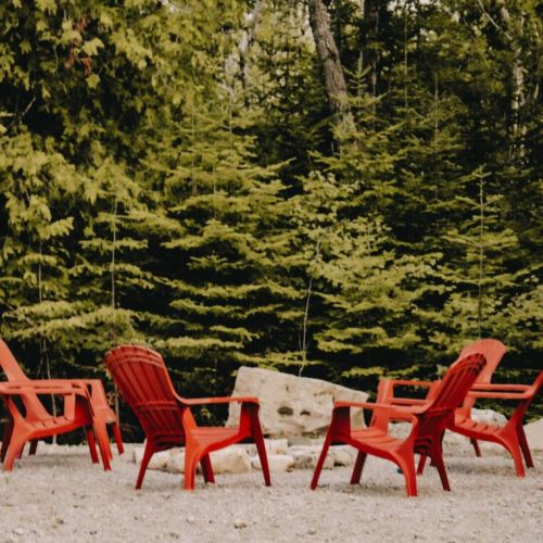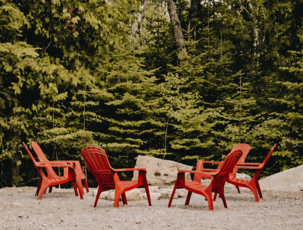 Surrounded by Muskoka chairs, nestled in a quiet winter woodland.