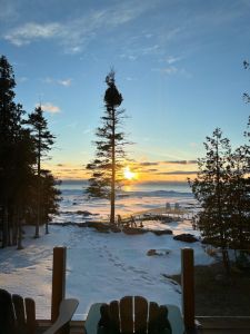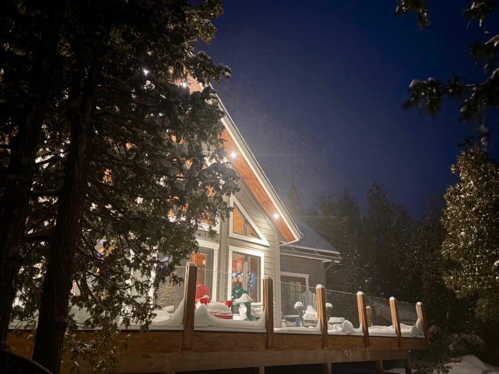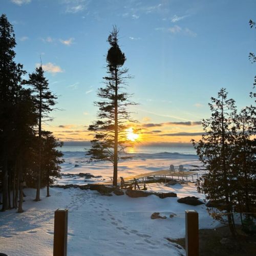 This stunning Lakehouse near Pike Bay is the epitome of sophistication and winter relaxation. The floor-to-ceiling windows bring the snowy waterfront into every corner of the home, creating a calm, glowing atmosphere unique to the season.
