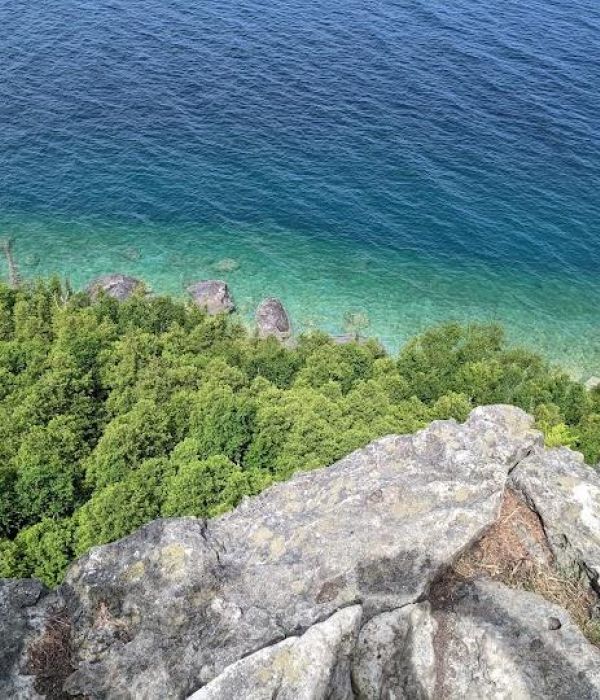 With Lion’s Head and Isthmus Bay just to the south, White Bluff is an easily recognizable landmark, with its craggy cliff towering above the water, topped by a layer of primitive white rock and forest.